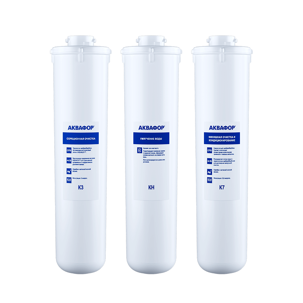 Комплект сменных модулей К3-KН-K7 обеспечивает глубокую очистку воды от хлора, органических соединений и других примесей.